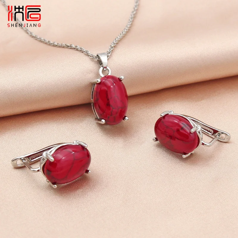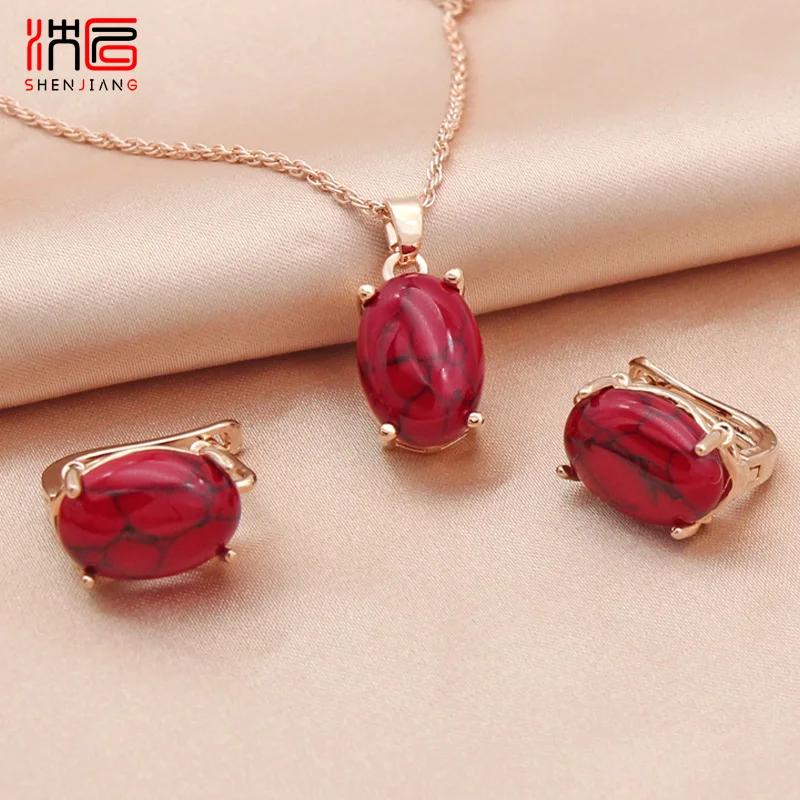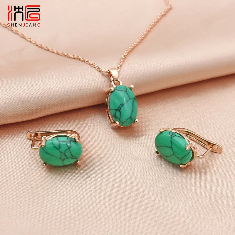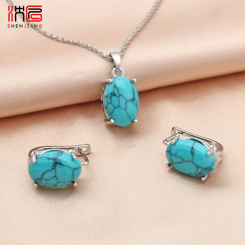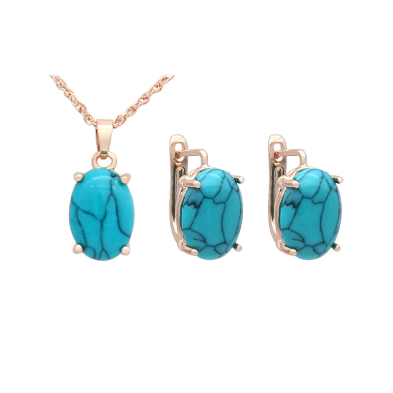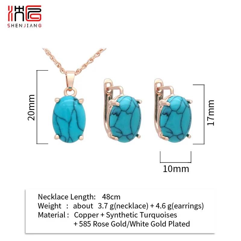 SHENJIANG New Oval Egg Shape Synthetic Turquoises Rose Gold Color Dangle Earrings Jewelry Sets For Women Wedding Necklace